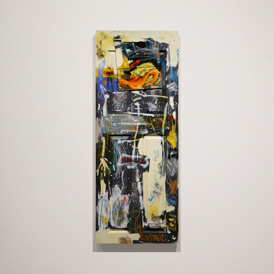 Mixed media including airbrush, spray paint, collage, crayon, oil and acrylic on wooden door
